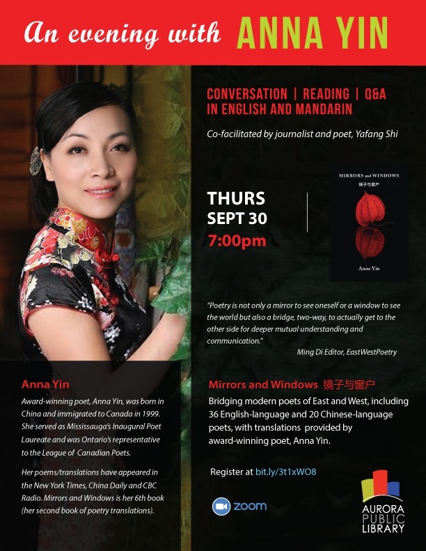 Award-winning poet, Anna Yin, was born in China and immigrated to Canada in 1999. She served as Mississauga’s Inaugural Poet Laureate and was Ontario’s representative to the League of Canadian Poets. Her poems/translations have appeared in the New York Times, China Daily and CBC Radio. Mirrors and Windows is her 6th book of poetry (her second book of poetry translations).