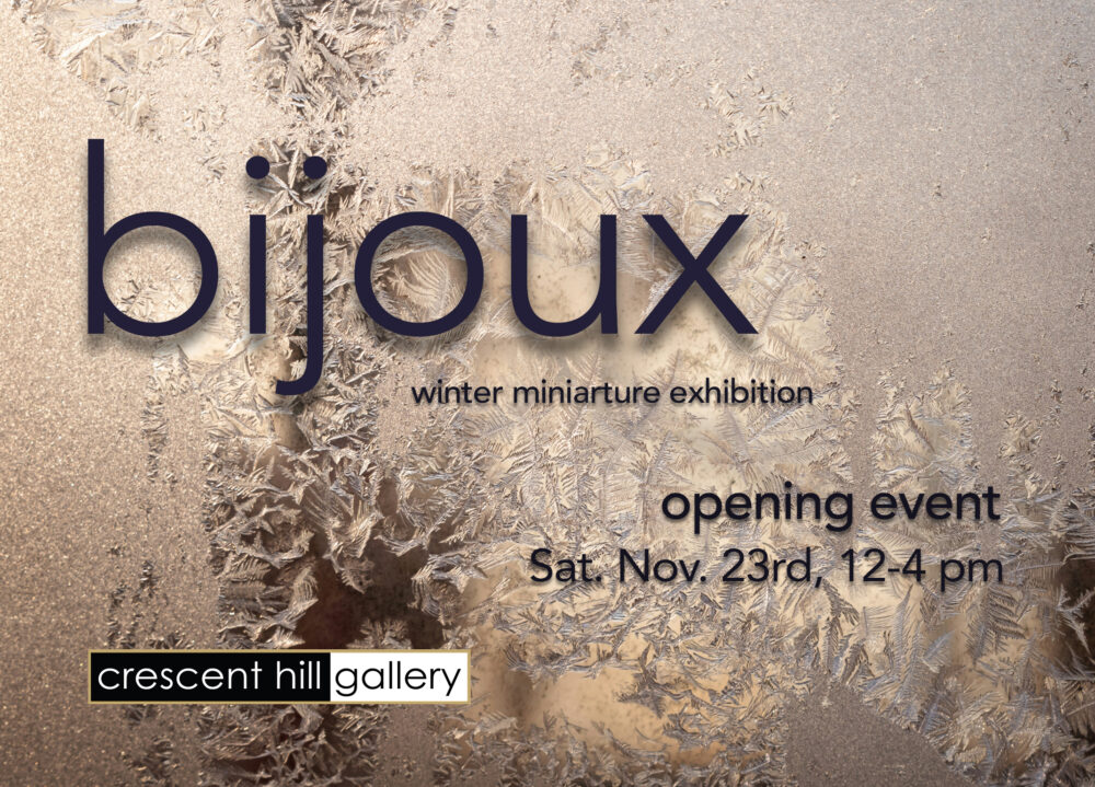 Join us for the Saturday opening event for our miniature art exhibition, Bijoux (little jewels). We will showcase artwork under 30×30 inches created by our gallery artists. These pieces will make excellent gifts or great additions to your collection. Original pieces in acrylic, oil, mixed media, collage, and small sculptural objects will be shown. Reach out to your loved ones this holiday season with a one-of-a-kind work of art that speaks to their individuality.