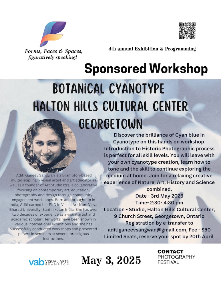 The Cyanotype Workshop [with non-toxic chemicals] is part of the opening events for the 4th annual FORMS, FACES & SPACES, figuratively speaking! show, running from 2:30 pm to 4:30 pm with participants finishing one project. There will be an overview of the rich history of this medium and arts practice presented and a take-away pamphlet on the history with more information on additional courses. Dr. Aditi Ganeev Sangwan studies and arts practice are with print-making, photography with alternate media [non-toxic chemicals], and painting. Send $50.00 by etransfer to aditiganeevsangwan@gmail.com All supplies and materials included. Limited Seats, reserve your spot by 20th April.
