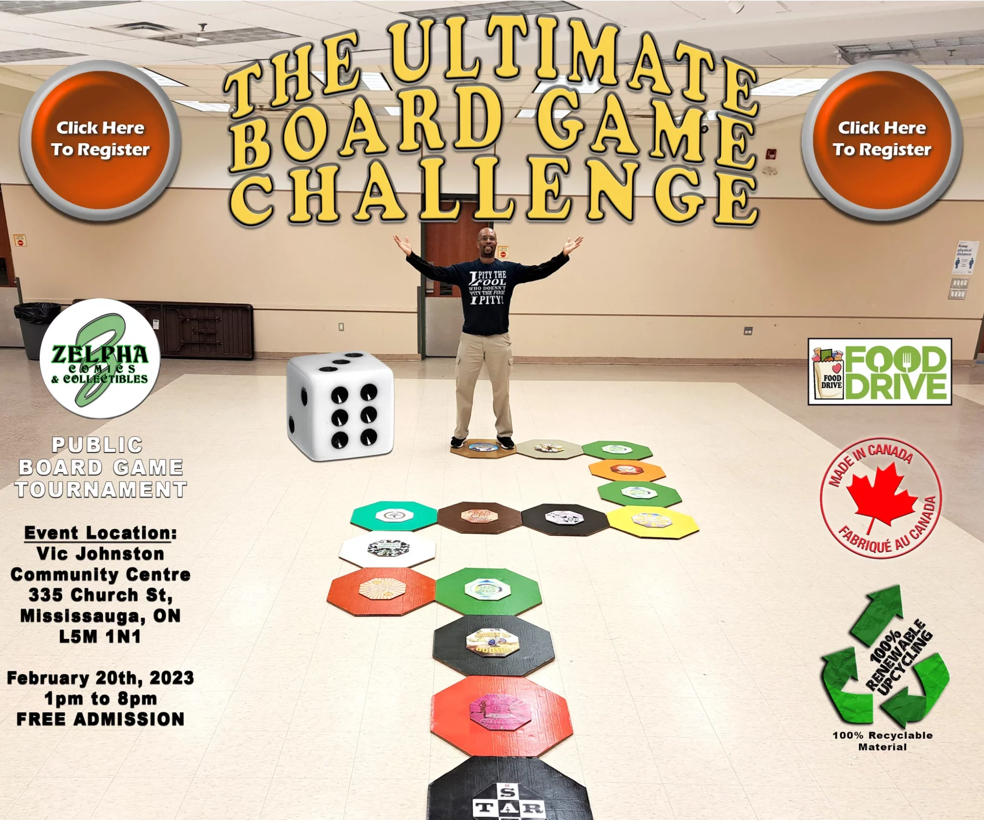 To be held at the Vic Johnston Community Center (335 Church St, Streetsville (Mississauga)), on Family Day (February 20th, 2023) will be the first public tournament of the new giant-sized board game called The Ultimate Board Game Challenge. This is a custom-designed board game tournament consisting of individual 2-foot-long octagonal playing spaces that form together to create a 700-800 sq ft board game. Each game space tells players what to do to gain the points needed to win the game. Selected patrons who register online on this website to attend the event will be chosen at random to play as the playing pieces to win prizes.