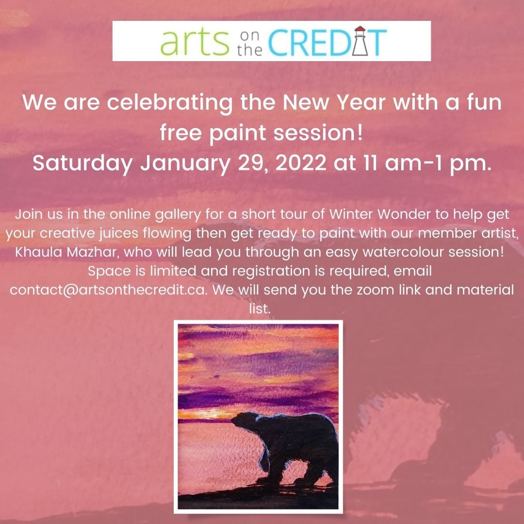 Get creative this New Year with Arts on the Credit! Join them Saturday, January 29, 11 AM – 1 PM in the online gallery for a short tour of Winter Wonder and then paint along with member artist Khaula’ Mazhar who will lead you through an easy watercolour session.