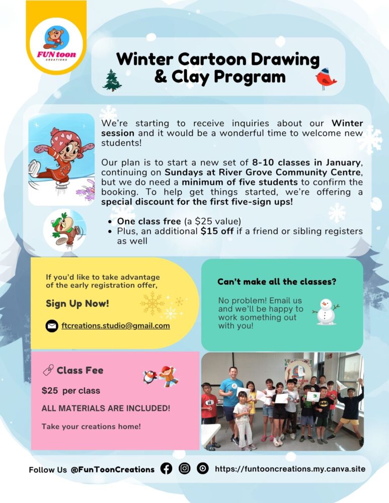Fun Toon Creations is planning to continue our fun art classes this January at River Grove Community Centre — but we need a minimum of 5 students to confirm the booking!