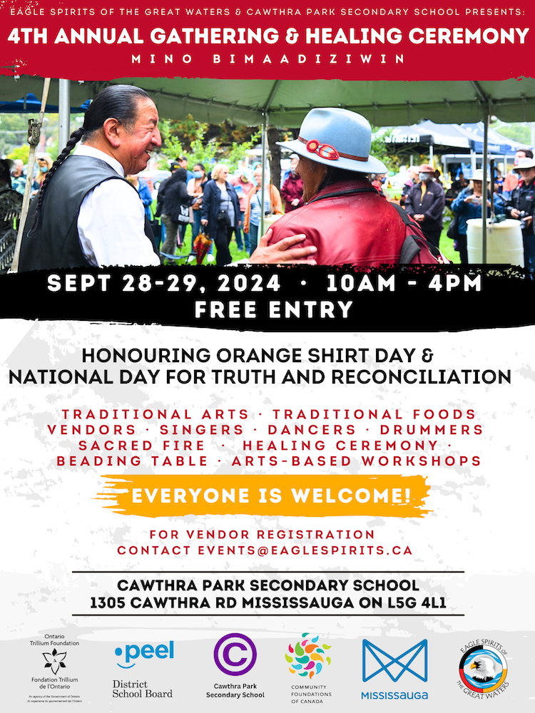 September 28th & 29th, 10:00-4:00pm! 1305 Cawthra Rd, Mississauga, ON L5G 4L1, Canada! Traditional Indigenous arts, food, vendors, singers, drummers, and dancers! Free weekend long event! Everyone is welcome!