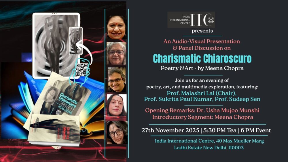 Step into the luminous world of Charismatic Chiaroscuro — where poetry, visual art, and digital media converge in a play of light and shadow. This special evening brings together an evocative short film, reflections from distinguished speakers on art’s evolving frontiers in the digital age and a conversation with the artist-poet Meena Chopra.