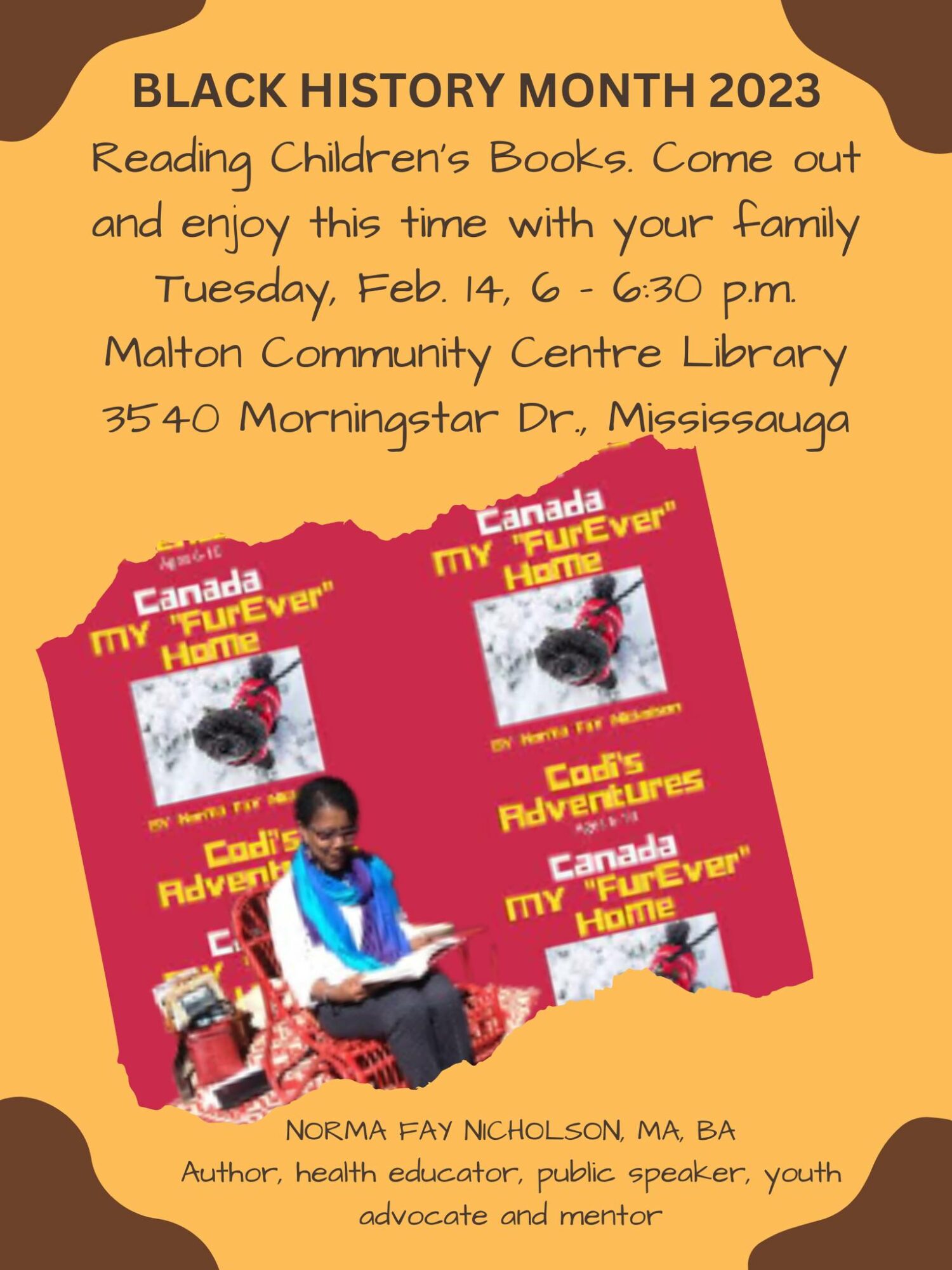 Author and youth advocate Norma Fay Nicholson will be reading children’s books at Malton Community Centre Library (3540 Morningstar Dr) on Tuesday, February 14 from 6-6:30 PM. She will specifically be reading a copy of her own children’s book inspired by her rescue dog, Codi, called “Codi’s Adventures. Canada My ‘Furever’ Home”.