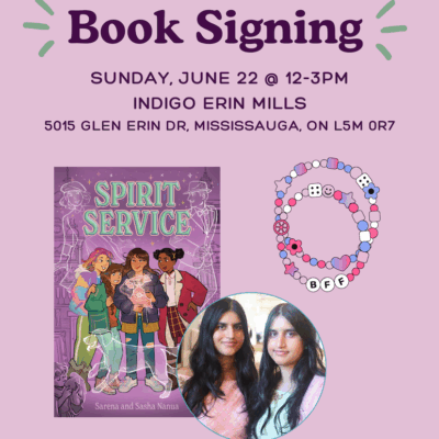Join Sarena and Sasha Nanua, twin authors of the middle-grade novel Spirit Service, for a book signing on Sunday, June 22, 12-3 PM at Indigo Erin Mills! Meet the authors, get your copy of Spirit Service signed, plus grab sticker freebies and friendship bracelets.