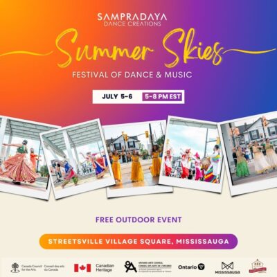 Sampradaya Dance Creations presents Summer Skies – A Festival of Dance & Music, bringing together rhythm, movement, and melody in a vibrant outdoor celebration. Streetsville Village Square July 5 & 6, 2025 5 PM to 8 PM Free Event! Experience an unforgettable summer evening of live performances, community spirit, and cultural vibrance—free and open […]
