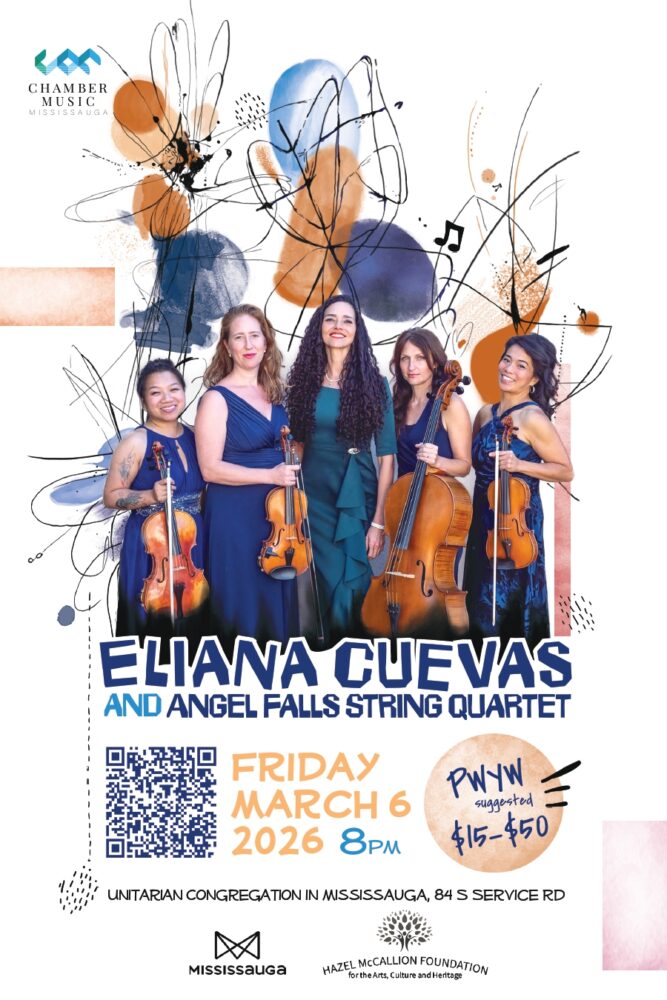 Eliana Cuevas embodies the spirit of music as a bridge between cultures, blending the rich traditions of her Venezuelan heritage with the innovative artistry of jazz and global influences.Her voice is a revelation—pure, expressive, and capable of conveying profound emotion in every note. With her, music transcends language, connecting audiences through the universal themes of love, resilience, and beauty. The collaboration between Eliana and the Angel Falls String Quartet is nothing short of magical. Eliana’s original songs, arranged for string quartet by the acclaimed JUNO Award-winning pianist Jeremy Ledbetter, highlight Eliana’s roots, merging Venezuelan tradition with contemporary flair. The quartet’s lush, intricate arrangements complement Eliana’s dynamic vocal range, creating a soundscape that feels timeless and groundbreaking.