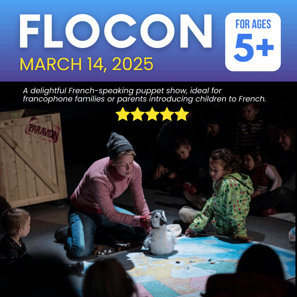 Join us for FLOCON, a delightful puppet show perfect for families during March Break. Embark on an enchanting journey through Canada’s Arctic alongside an adventurous explorer and a charming penguin named Flocon. Encounter captivating puppets, stunning visuals, and a heartwarming story that will ignite your child’s imagination. This all-ages performance is an unforgettable adventure you won’t want to miss. Ideal for francophone families or those learning French.