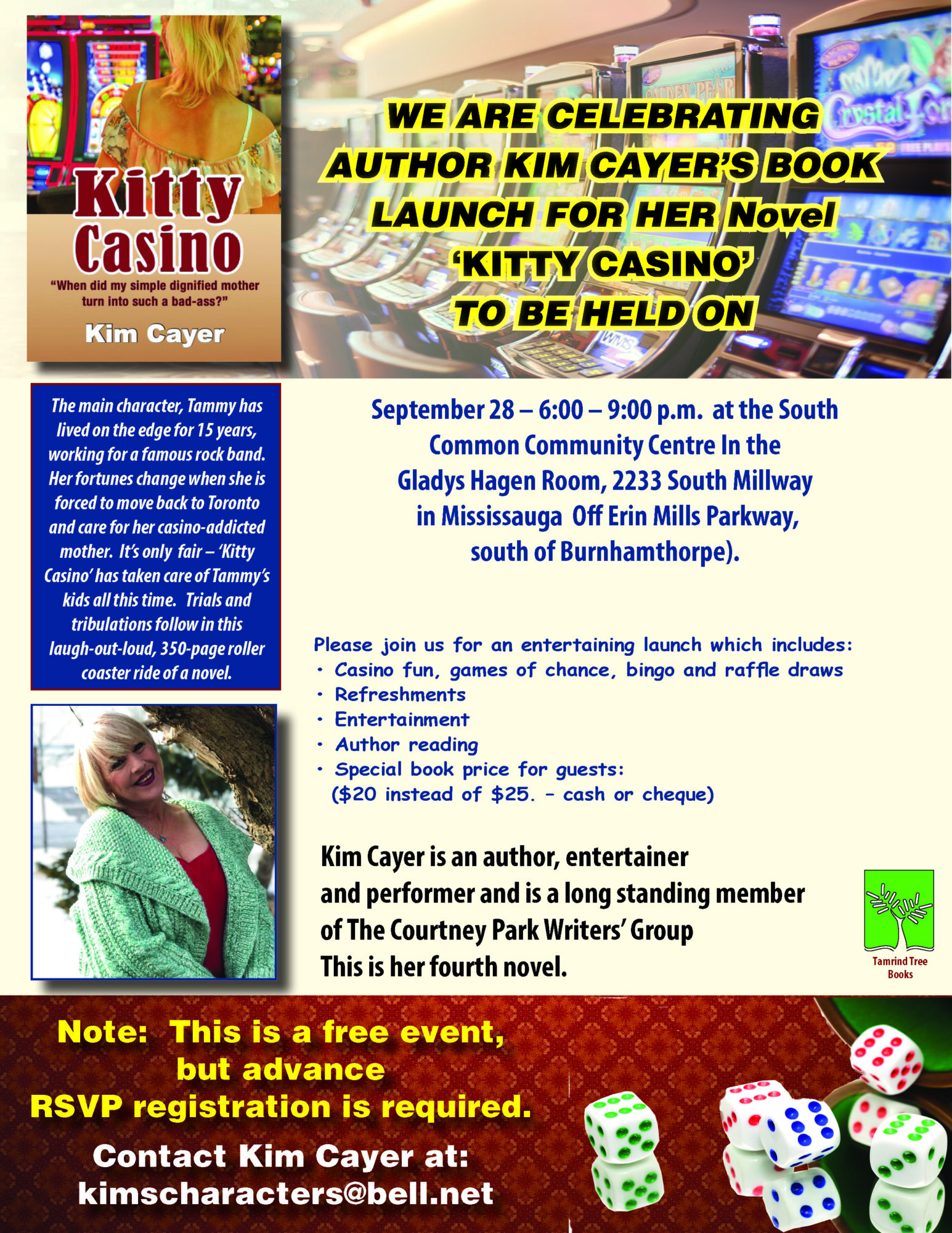 Please join Kim Cayer for the launch of her novel, “Kitty Casino” to be held on September 28, 6-9 PM at South Common Community Centre in the Gladys Hagen Room.