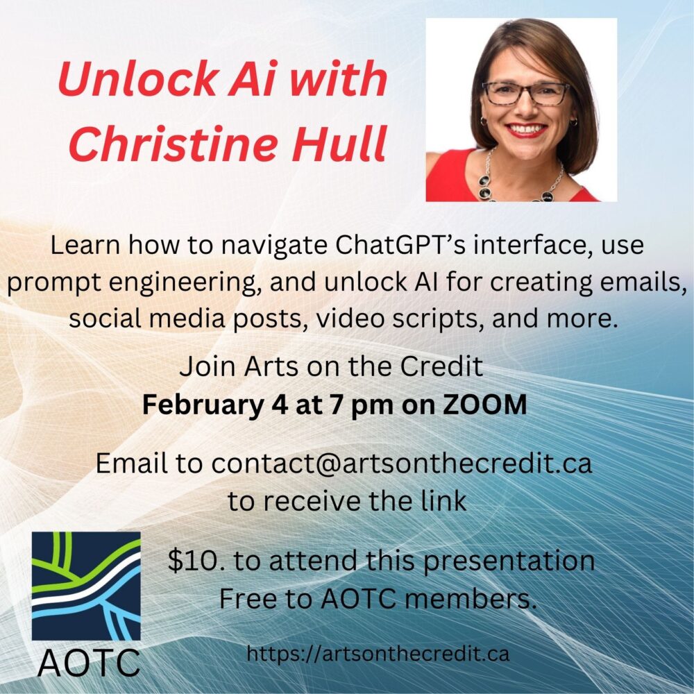 Christine Hull will be facilitating “ChatGPT Basics: AI Training for Beginners” for Arts on the Credit, where she’ll guide artists through the fundamentals of AI, showing them how to leverage ChatGPT to enhance their creative and business endeavors.