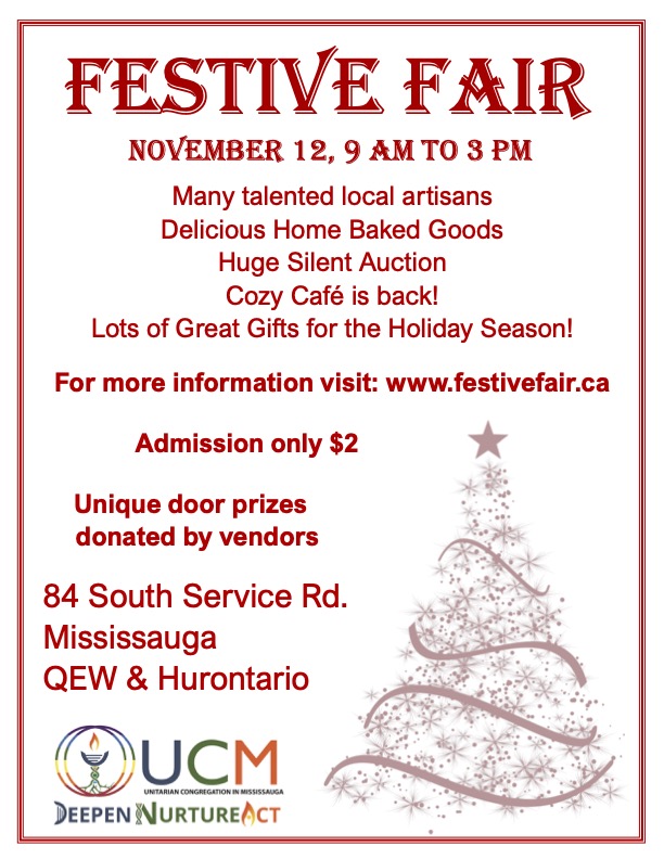 Unitarian Congregation in Mississauga Annual Festive Fair November 12th – 9-3pm 84 South Service Road, Port Credit Many talented local artisans Delicious Home Baked Goods Cozy Café Huge Silent Auction […]