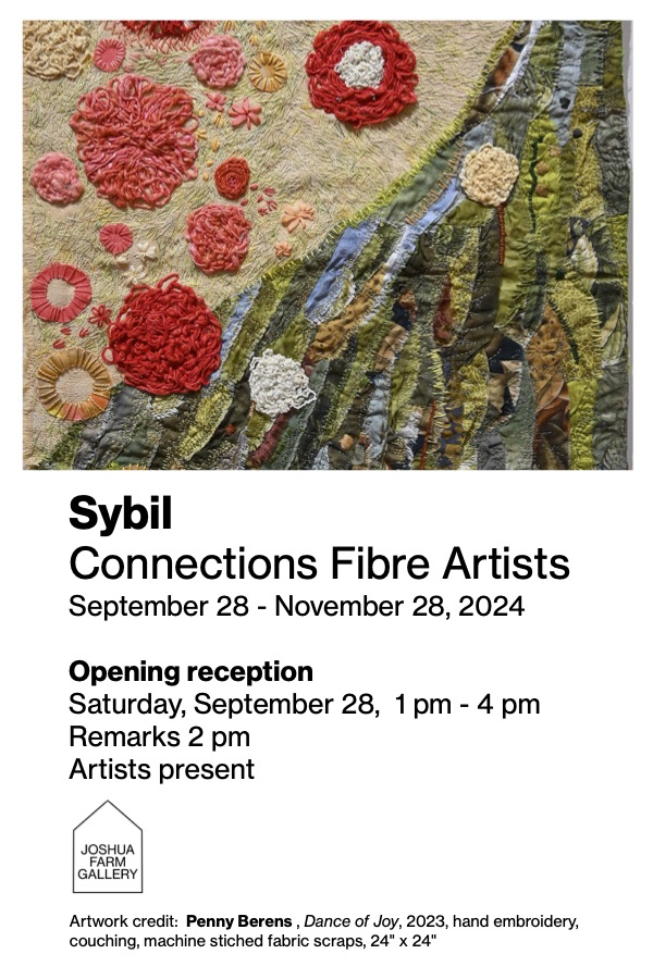 Nov 15 Featured September 28, 2024 - November 28, 2024 Recurring Sybil – Connections Fibre Arts – Joshua Farm Gallery Joshua Creek Heritage Arts Centre 1086 Burnhamthorpe Road E., Oakville Event Details Get Directions