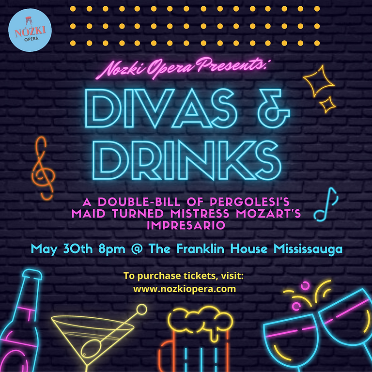 Nozki Opera’s comic double-bill Divas & Drinks is coming soon to both downtown Toronto and Mississauga. When and where? Monday, May 30th | The Franklin House (Mississauga) | 8pm Monday May 31st | The Tranzac Club (Toronto) | 8pm How do I buy tickets? Purchase tickets at https://www.nozkiopera.com/divasanddrinks What is the show about? In Pergolesi’s “The Maid Turned Mistress”, a wealthy businessman and his […]