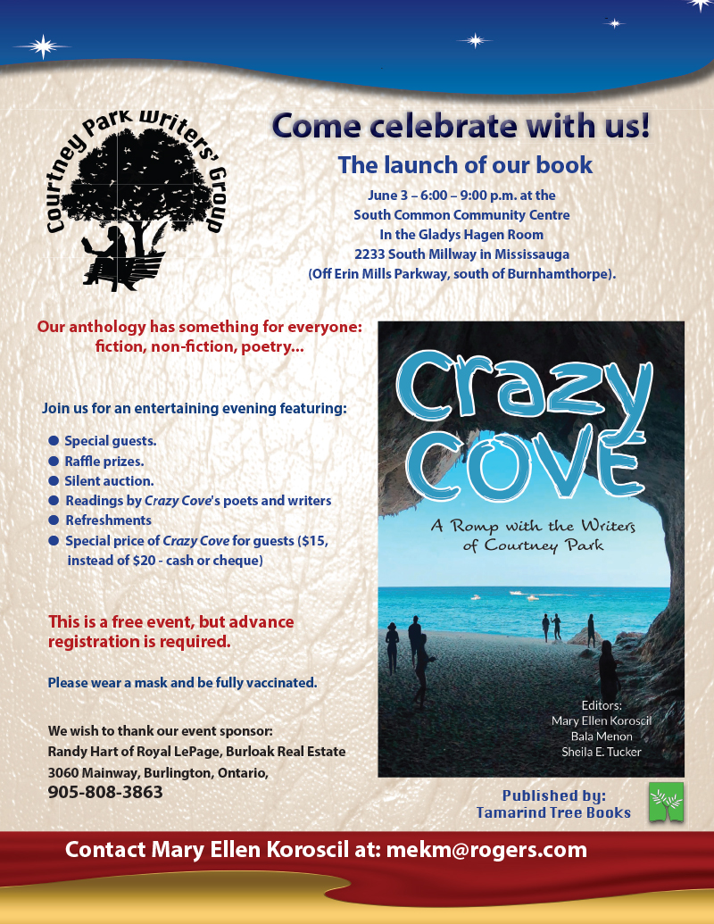 Everyone is cordially invited to attend Courtney Park Writers Group’s book launch and invite a guest to join them on June 3, starting at 6:00 – 9:00 p.m. at the following location: South Common Community Centre In the Gladys Hagen Room 2233 South Millway Mississauga. (Off Erin Mills Parkway, south of Burnhamthorpe). PLEASE WEAR A […]