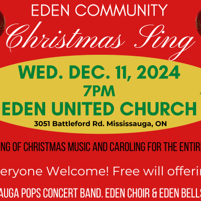 The Mississauga Pops, Eden Choir and Eden Bells Apeel invite you to join us in celebrating the season through music and carolling. Everyone Welcome! Voluntary contributions to the local food bank greatly appreciated.