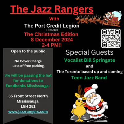We have a special group of young teenage jazz musicians joining us for a few tunes. All proceeds from donations will be going to Foodbanks Mississauga! The Port Credit Legion is open to the public with a full bar featuring low Legion prices, free parking and a great location beside the Credit river.