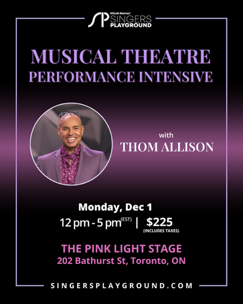 Award-winning Musical Theatre Performer and Director THOM ALLISON (Broadway “Priscilla, Queen Of The Desert”, Stratford “Rent”, “La Cages Aux Folles”) is coaching a 5 hour intensive where participants have the opportunity to dig in to the craft of musical theatre performance with special focus on creating a stand-out personal interpretation, using details in the text and music.