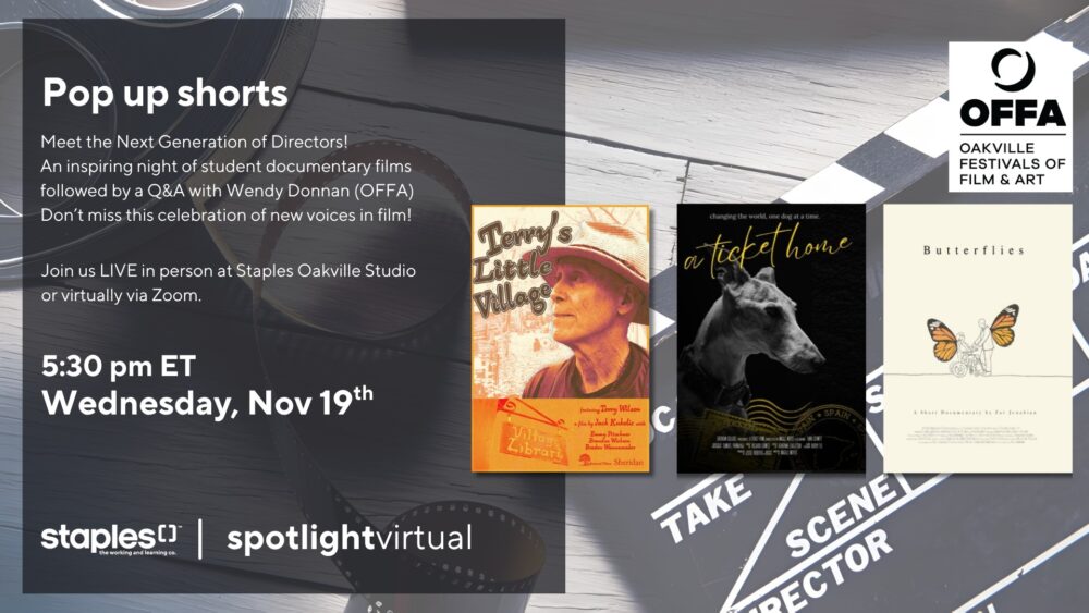 Join us on November 19 at the Staples Coworking Studio in Oakville for the first Pop Up Shorts, an inspiring night of student short documentary films followed by a Q&A with Executive Director and Cofounder of OFFA, Wendy Donnan. Don’t miss this celebration of new voices in film! Filmmakers include Jack Kukolic whose film about a Mississauga resident and icon, Terry’s Little Village, and Magill Moyes, whose short film A Ticket Home, have been huge successes on the festival circuit. And Meet Zav Jenabian, a short filmmaker from York University with his beautiful film, Butterflies.