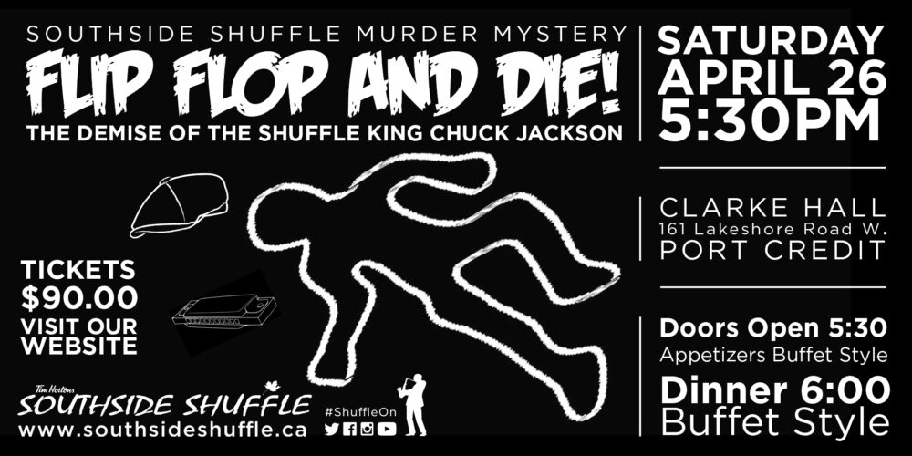 Southside Shuffle Murder Mystery Night at Clarke Hall in Port Credit, Mississauga Saturday, April 26thFlip Flop and Die: The Demise of the Shuffle King Chuck Jackson promises an unforgettable evening of fun, mystery, laughter, and a delicious buffet dinner in support of the Southside Shuffle Blues & Jazz Festival.