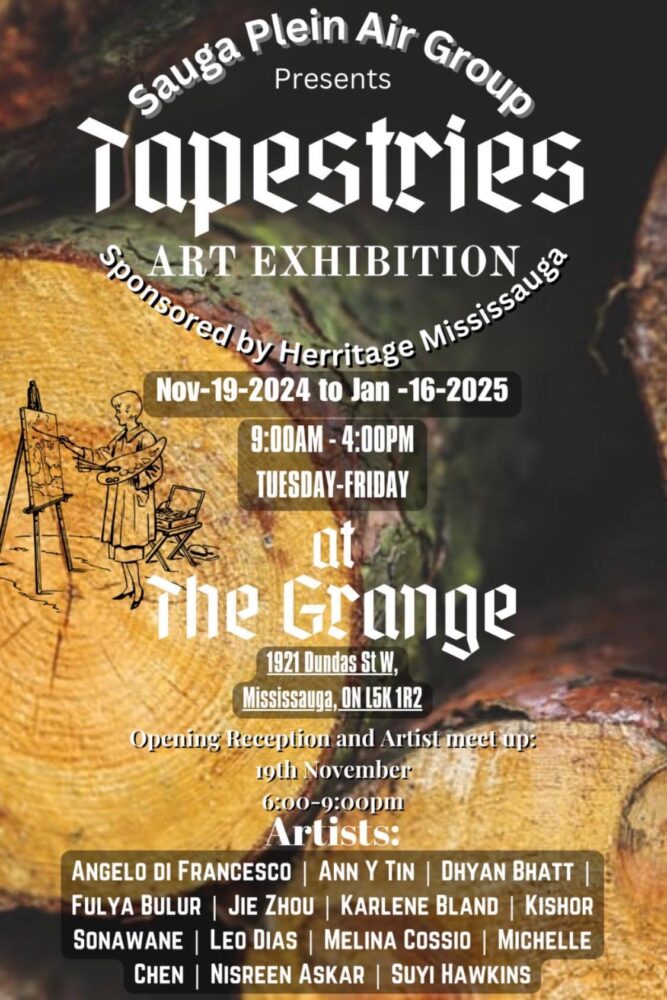 Sauga Plein Air Groip Art Show & Sale “Tapestries”Hosted by Heritage Mississauga at The GrangeSauga Plein Air a group will be showing samples of their Plein Air paintings created in 2025 of Mississauga Parks, The Credit River and Heritage Locations.Tapestries exemplifies the interwoven fabric of Mississauga’s history, contemporary landscape, and future aspirations, crafting a compelling narrative that bridges our present existence with the Credit River, public parks and landmarks that defined Mississauga’s transformation and will continue to foster a vibrant city for generations to come.Opening Reception: Tuesday, November 19th, 2024Time: 6 pm to 9 pmAddress: 1921 Dundas St. W, Mississauga, ON L5K 1R2