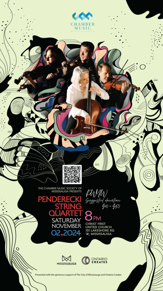 The Chamber Music Society of Mississauga presents the internationally renowned Penderecki String Quartet in concert – Saturday, November 2, 2024 – 8 pm at Christ First United Church – 151 Lakeshore Road, West, Mississauga. PWYW