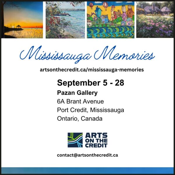 Arts on the Credit is thrilled to announce the launch of a special exhibit titled “Mississauga Memories” to commemorate the 50th anniversary of the City of Mississauga. The exhibit will be held from September 5 to September 28, 2024, at the Pazan Gallery, 6A Brant Avenue, Port Credit.