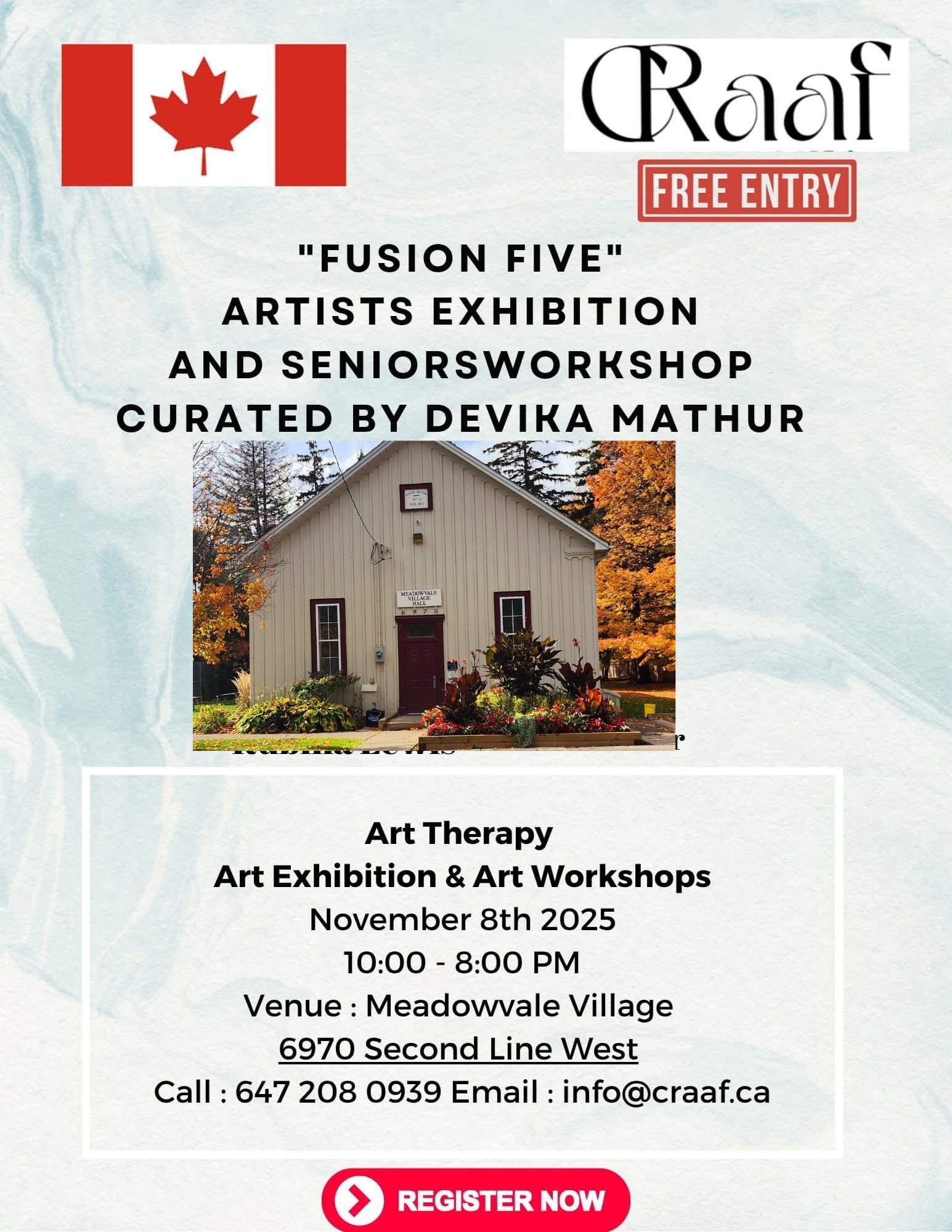 Meadowvale Village Hall 6970 Second Line West, MississaugaFusion Five: Art Exhibition & Seniors Workshops with Live Music 🎶 Date: November 8th, 2025 Time: 10.30 AM – 7:00 PM Location: Meadowvale Village Hall 6970 Second Line West Mississauga Join us for a day filled with creativity, connection, and celebration at Fusion Five, a vibrant art exhibition featuring local artists and interactive art workshops […]