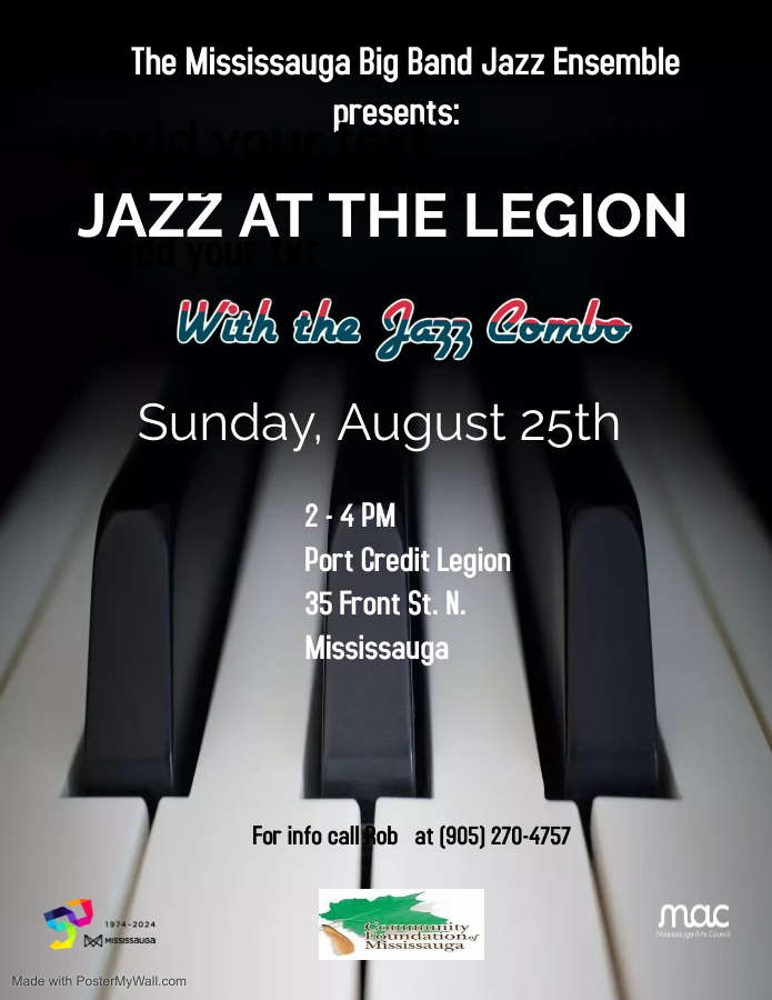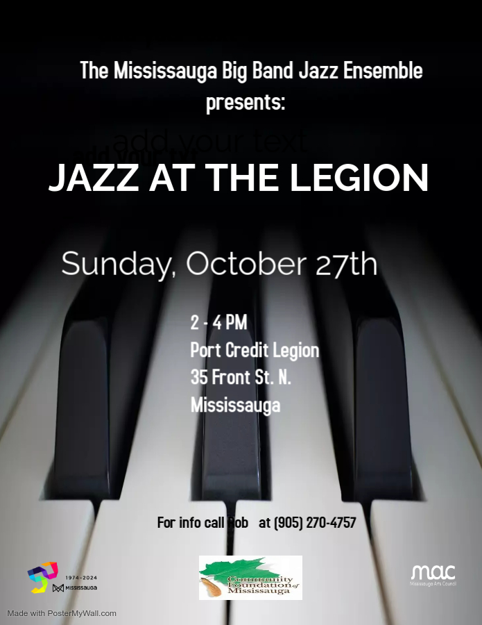 The Mississauga Big Band Jazz Ensemble is band is back for its monthly gig at the Port Credit Legion ( 35 Front St. N. )Â featuring singer Denise Leslie, Enjoy some new arrangements and LIVE MUSIC! This event is Pay What You Can. Questions? Call Rob at (905) 270 4757.