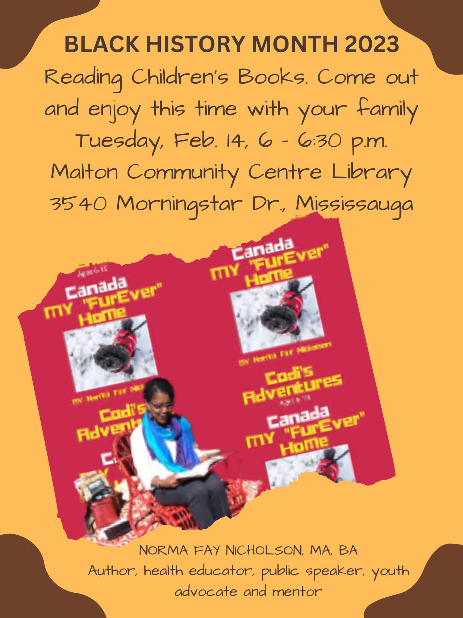 Author and youth advocate Norma Fay Nicholson will be reading children's books at Malton Community Centre Library (3540 Morningstar Dr) on Tuesday, February 14 from 6-6:30 PM. She will specifically be reading a copy of her own children's book inspired by her rescue dog, Codi, called "Codi's Adventures. Canada My 'Furever' Home".