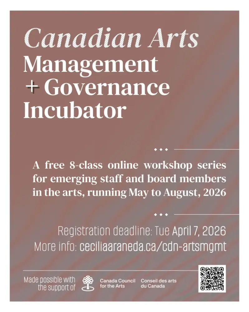 The Canadian Arts Management + Governance Incubator program is aย free online workshop seriesย open to emerging and aspiring Canadian arts sector workers and board members connected to groups or organizations with annual budgets under $1 million.