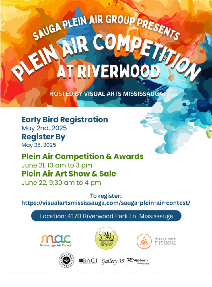 The Sauga Plein Air Group, in collaboration with Visual Arts Mississauga, is proud to host the first-ever Plein Air Competition at Riverwood Park. 50 Artists from across Ontario who enjoy creating outdoors will be taking part in this two-day public event on Saturday, June 21 and Sunday, June 22, 2025.